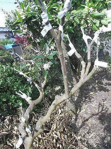 2本の「宮川早生」という温州ミカンの木の枝に、「イヨカン」を「高接ぎ」しました。 |