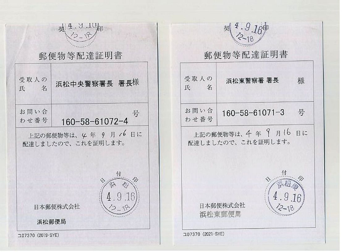 下の浜松中央警察署長宛と浜松東警察署長宛に郵便書留の手紙を出す数日前に、本件の犯罪者の爺が交通事故に見せかけて起こした凶悪事件について、このままだと単なる交通事故として処理されてしまい被害者が浮かばれないと、慌てて警察署長宛に手紙を出しました。 事件の重大さと緊急を要する事を強調しようと、「配達証明」と「本人限定受取」の郵便オプションを付けようとしましたが、封筒に受取人の氏名の記載が無く、「警察署長」だけでは本人確認ができないので、「本人限定受取」は付けられませんでした。 その数日前に、新聞各社の社長宛や野党三党宛にも手紙を出させて頂きましたので、全国のマスコミ関係者だけでなく全国の膨大な人々が事件の全容を御存知の事と思います。 2022年9月15日付けの書留郵便の年月日と過去の「対ドル・円相場」の推移を照らし合わせて頂ければ、円安の原因が本件である事は一目瞭然です。 なお、2022年9月15日付けは下の、「書留・特定記録郵便等受領証」の画像の最下部に記載されています。 なお、「犯罪者の爺」は、上記の後にも、交通事故に見せかけて凶悪犯罪を起こしています。 ・ ・ ・ ![]() 上の画像では郵便局が発行した「書留・特定記録郵便等受領証」の受領年月日が小さくて見難いので、「元の受領証」をスキャナーでパソコンに取り込んだ際の高解像度の画像から、下の画像を切り取りました。 郵便局が発行した「書留・特定記録郵便等受領証」の現物も大切に保管して有ります。 ![]() 郵便局が発行した「配達証明」の画像で、現物も大切に保管して有ります。 なお、書留郵便ではありませんが、普通郵便で同じ内容の手紙を浜松西警察署の署長宛にも出しました。 上記の凶悪事件に関して、管轄の警察署の署長宛てに出した書留郵便の手紙の配達証明書が下記の画像です。 |