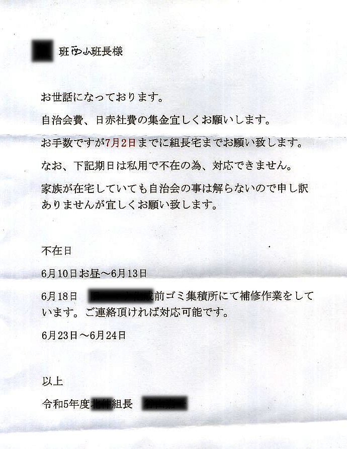 またもや、自治会関係のトラブルだらけです。 本年度(令和5年4月〜令和6年3月末)は、私が属している班の班長は順番通りに私が成りましたが、最初からトラブルだらけです。 令和5年4月16日の10時頃に自治会関係の徴収費用を「組長宅」に持参しました。 その内訳は、浜松市消防団・・・・・○○分団後援会費1,000円+緑の募金100円で、私の分も含めて全10世帯で合計11,000円。 私が属している班の「我が家以外の家庭」と「私の分」を含めて、自治会関係の徴収費用を「班長」の上の「組長」の自宅に持参して手渡し、その際に、私が「組長」に、「組長」から「私」への「受取証」を求めしましたが、 全家庭へ配る自治会からの領収証と「緑の募金のシール」を私(班長)に渡したから、領収証が二重に成るので、「組長」から私(班長)への「領収証」を渡す必要はな無い!!の一点張りで、「お話にならない」ので、近所の家に聴こえるように声を荒げて様々な事を言って早々、我が家に帰って来ました。 前回、十年ほど前に、私が属している班の「班長」を務めた時には、小学校の時の同級生の女性の家庭が組長(同級生の旦那/入婿?)の自宅に、私が属している班の「全家庭」と「私の分」を含めて、自治会関係の徴収費用を持参する度に、必ず、「組長代理?」の同級生の女性が「市販の領収証」に必要事項を記載した「領収証」を出しましたので、当然、自治会が組長に指示しているのでは? ![]() その組長が三月下旬に挨拶に来た時には、「仕事で帰りが遅くなるので、市の広報など回覧板で回す自治会関係の配布物を何処に置いたらいいですか?」と訊いたので、玄関の外の柱に取り付けてある郵便箱の下の回覧板入れ(奥行きは少ないが大きい郵便箱)に入れて下さいと答えました。 その際に、その組長が「午前中は、だいたい居ます。 来る前に電話して下さい」と言いました。 私の班の前任者からの「引き継ぎ物」の中に小さなメモの紙片が入っていて、自治会が各家庭に回覧板で配る配布物を、「組長」が「班長」に配る日は、毎月、7日と22日で、「社務所(近所の神社)に取りに行きます」と手書きで記載されていましたが、組長が三月下旬に挨拶に来た時に、「仕事で帰りが遅くなるので、市の広報など回覧板で回す自治会関係の配布物を何処に置いたらいいですか?」と訊いたので、前記のメモの紙片は無視して、初回の4月7日に、市の広報など回覧板で回す自治会関係の配布物を「社務所(近所の神社)に取りに行きませんでした」。 ![]() 4月8日の朝に、玄関の外の柱に取り付けてある郵便箱の下の回覧板入れに市の広報など回覧板で回す自治会関係の配布物が入れて有りましたので、前記の「引き継ぎ物」の中の小さなメモの紙片に記載されていた事は嘘だった事になりますので、「証拠」として保管して有ります。 (「現物」とスキャナーでパソコンに取り込んだ画像ファイルの二重に保存してあります) 初回の市の広報など回覧板で回す自治会関係の配布物が組長から届けられる数日前に、「4月の組長の在宅スケジュールの文書」と共に茶封筒に入れられて我が家の郵便ポストに入れられていた文書と、前記のメモ書きが、妙に符合するのは・・・・・ ![]() (「現物」とスキャナーでパソコンに取り込んだ画像ファイルの二重に保存してあります) なお、前記の「4月の組長の在宅スケジュールの文書」は、私だけに寄越した「文書」で、同じ組の残りの7班の班長には配っていない疑いを感じています。 果たして、同じ組の8班の班長8人全員に「4月の組長の在宅スケジュールの文書」を渡したのだろうか? (「現物」とスキャナーでパソコンに取り込んだ画像ファイルの二重に保存してあります) なぜか、「5月の組長の在宅スケジュールの文書」は未だに届いていません。 市の広報など回覧板で回す自治会関係の配布物に前記の、自治会からの領収証と「緑の募金のシール」が同封されていたので、早速、4月8日(土曜日)の午前8時半過ぎに、組長の自宅に自治会関係の徴収費用を持参したら夫人が応対して、「主人は、今日は出掛けていて明日の夕方にならないと帰って来ません」「あー、ー、ー、主人でないと全く分かりませ!!」と如何に面倒臭そうに、如何にも嫌そうに言われたので、私は早々退散しました。 なお、私の班では、班長の手間を軽減する目的で、4月下旬から5月頃に一年分の自治会関係の徴収金や様々な寄付金などを、各家庭から一括して集金して預かり、預かった金から自治会関係の徴収金や様々な寄付金などを支払う仕組みになっていて、例年、各家庭から一括して一万三千円ほど集金して、年度末に、残金がでれば返却する仕組みになっています。 自治会の年間の集金予定の書類を見ると、今年は一万四千二百円の予定ですが、何度、集金に出向いても留守で無駄足になるかも知れないので、わざわざ嫌な思いをさせられる事も無いので、当面、集金するのは止めておいて、自治会関係の徴収金や様々な寄付