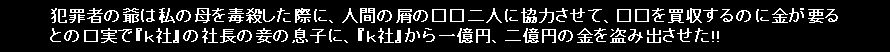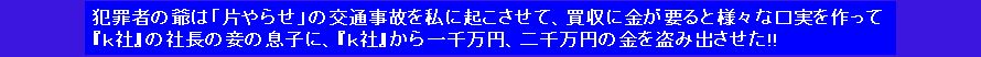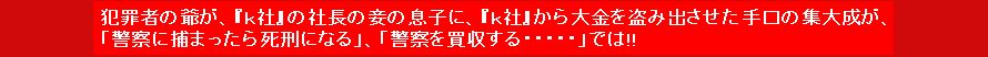 10億円、20億円というような巨額の金を『k社』から盗み取った犯罪者の爺に金で釣られた、「金の為なら何でもする金の亡者達」 本件の犯罪者の爺は、『k社』から20億円以上?の金を盗み取っているにも関わらず、所得税を一円も納めていず?、完全無税の20億円以上?の金を「金かね、金かね、金かね、金かね、・・・の、金の為なら人殺しでも、何でもする金の亡者達」に湯水のように、ばら蒔いて金の亡者達を思いのままに「犯罪という舞台」で踊らせ続けている。