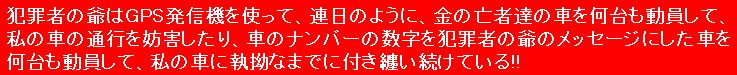 犯罪者の爺は私の車にGPS発信機を仕掛けていて、24時間・リアルタイムで私の車の位置を監視していて、私の行き先を予想して、先回りして、私の行く先の店舗の買収済み、あるいは、その場で買収した店員に携帯電話で指図して、その店員に、私に様々な事をし続けています。左の画像の機器は「盗聴妨害器」で妨害電波を発信して、GPS発信機の通信を妨害するのに使っていましたが、GPS発信機の近くに設置しないと効果が無く、また、現在仕掛けられているGPS発信機には周波数の関係か全く効果が無いので使っていません。 現在使っている車の新車納車時に、犯罪者の爺に買収された人間に、既に、故意に不具合を生じさせられていて、販売店に連絡して車を預けた際に、まず一台目のGPS発信機を仕掛けられ、そのGPS発信機を利用して私の車の移動をリアルタイムで監視して、金で釣った自治会・・・の名刺を示した爺に、私の車を故意に交通事故に巻き込ませました。 過失割合は私が1で、相手が9で決着しましたが、単なる交通事故ではなく、爺が金で釣った自治会・・・の名刺を示した爺に、私の車を故意に交通事故に巻き込ませた「片やらせの交通事故」でした。 交通事故の賠償交渉の際に、過失割合が、私が1で、相手が9で有るにも関わらず、相手方の任意保険会社の責任者を爺が金で釣って、私に対して故意に民事訴訟を起こしましたが、簡易裁判所で、私が一切争いませんでしたので数分で終わりました。 その任意保険会社が手配した自動車板金修理工場に車を預けた際に、二台目のGPS発信機を仕掛けられました。 それらの一連の行為で、犯罪者の爺は、買収に金が要る、買収に金が要ると様々な口実を言って、『k社』の社長の妾の息子に、『k社』から一千万円、二千万円の金を盗み出させたのでは。 上記の犯行で、犯罪者の爺は相当味を占めたのでは。 上記の二台のGPS発信機は、車のヒューズボックスからオーディオの配線のヒューズと、ルームランプの配線のヒューズを抜いて動作しなくしましが、 カー用品店でタイヤを買った際に、タイヤの交換作業を待っている間に、また新たなGPS発信機を仕掛けられ、そのGPS発信機で24時間・リアルタイムで私の車の位置を監視して、犯罪者の爺は執拗なまでの付き纏いを続けています。 なお、犯罪者の爺は、上記と同様の手口で、『k社』の社長の妾の息子に、『k社』から一億円、二億円の金を盗み出させています。 過去に書留郵便で、総理大臣や野党に出した手紙に記載して有る事ですので、下記の人間の屑の□□二人についても徹底的に捜査済みで、犯罪者の爺と同時に他の共犯達も同時に一斉逮捕されるのでは。 犯罪者の爺は私の母を毒殺した際に、人間の屑の□□二人を協力させて、□□を買収するのに金が要るとの口実で『k社』の社長の妾の息子に、『k社』から一億円、二億円の金を盗み出させました。 上記の犯行で、犯罪者の爺は更に味を占めたのでは。 前記のような犯罪者の爺が、『k社』の社長の妾の息子に、『k社』から大金を盗み出させた手口の集大成が、「警察に捕まったら死刑になる」と『k社』の社長の妾の息子を脅して・・・・・・・・・・・・では。 上記の人間の屑の□□二人は、『k社』の社長の妾の息子が刑務所から出所して来て証言したら「終わり」では。 もし政治の情勢が変わって、本件の犯罪者の爺が警察に逮捕される事態になれば、当然、上記の人間の屑の□□二人も、母に対する「殺人」の共犯として刑事裁判に掛けられて、死刑、または、無期懲役、もしくは、執行猶予無しの刑期の長い有期懲役で刑務所行きになるのでは。 強盗殺人や身代金目当ての誘拐殺人、保険金殺人など、「金目当ての殺人には死刑判決が多く、上記の人間の屑の□□二人も、『k社』の社長の妾の息子の証言や、犯罪者の爺の供述次第で、死刑判決の可能性が大いに有り得るのでは。 ![]() 犯罪者の爺は私の車に仕掛けたGPS発信機を使って、連日のように、金の亡者達の車を何台も動員して、 私の車の通行を妨害したり、車のナンバーの数字や車種、車の色などを犯罪者の爺のメッセージにした車を何台も動員して、私の車に執拗なまでに付き纏ったりし続けています。 私が早朝散歩に行く国道一号線の南に広がる畑作地帯に行くまでの幾つかの経路を予想し、私の車のGPS発信機の電波で、パソコンの画面の地図上の私の車の位置をリアルタイムで監視しながら、リアルタイムで携帯電話で「金の亡者達の車」に指図して、擦れ違えない道幅の狭い道路で鉢合せさせたり、私の車の通行を妨害したり、私の車の後を付いて来させたりしてい、その常軌を逸した執拗なまでの付き纏いに辟易しています。 私は道路をバックで、前進と同じ感覚で幾らでも走行できますので、たいがい、私が擦れ違いが出来る道幅が広い所まで後退して道を譲っていますが、その無駄な事の繰り返しに辟易しています。 早朝散歩の行きと帰りの両方で、それぞれ「金の