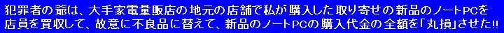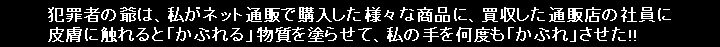 犯罪者の爺は、私がネット通販で購入した中古ノートPCに、買収した通販店の店員に皮膚に触れると「かぶれる」物質を塗らせて、私の手を酷く「かぶれ」させました。購入した店舗は、全国に実店舗を展開していてパソコンに限らず、様々な商品の買取・販売をしている会社の関東地方の▲▼◆■店(実店舗)で、過去に、この会社の様々な地方の実店舗からネット通販で、3台の中古パソコンを購入し、全て正常に動作し、取引も円滑に行わたので、この会社を信用して、2022年11月頃に、関東地方の▲▼◆■店(実店舗)からネット通販で購入しましたが、商品が届いて、届いた中古ノートPCを使い始めたら、翌日には手の甲が酷く「かぶれて」手が痒くなりました。 一晩ブランクが有るのは、前日は介護などに使うゴム手袋を手に嵌めてパソコンを操作していて、そのゴム手袋に付着した「皮膚に触れると『かぶれる』物質」が、手で触った様々な物に再付着して、更には使い回していたゴム手袋の裏側にも再付着してと、様々な経過を経て手の甲に付着して、手の甲が酷く「かぶれ」て手が痒くなりました。 なお、「かぶれ」るのは、皮膚の薄い甲の側だけで、手の皮膚の厚い手の平の側は全く「かぶれ」ませんでした。 それ以前の過去に、犯罪者の爺は、私がネット通販で購入した様々な商品に、買収した通販店の社員に皮膚に触れると「かぶれ」る物質を塗らせて、私の手を何度も「かぶれ」させていて、かぶれの原因が購入した中古ノートPCに有るのは明白でしたので、洗面器に入れた水に濃い目に台所用の中性洗剤を混ぜて、その液をタオルに浸み込ませて、ノートPCを始め手で触った物や部分を、何度も、繰り返し拭いてから、最後に水拭きしたら手の「かぶれ」は治まりました。